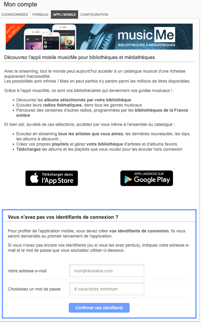 Téléchargez ensuite l'application MusicMe sur votre appareil (smartphone, tablette) . Une fois celle-ci installée, rentrez vos identifiants puis cliquez sur le bouton "Connectez-vous" :