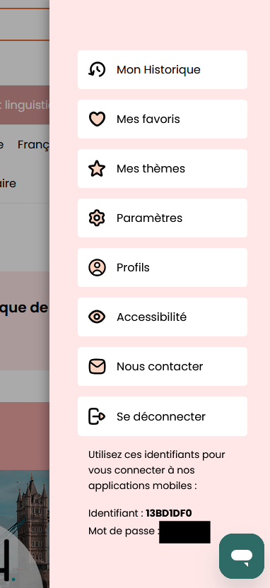 Si vous n'arrivez pas à scanner le QR Code avec votre smartphone ou tablette, vous avez également la possibilité de renseigner un identifiant et un mot de passe. Pour les retrouver, retournez sur le site de ToutApprendre et cliquez sur l'icone représentant votre compte. Un menu apparait. Vous retrouverez tout en bas votre identifiant et votre mot de passe à renseigner ensuite sur votre application.