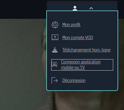 Rendez-vous sur la page du film que vous souhaitez voir sur le site de la Médiathèque Numérique d'Arte. Cliquez sur l'icône de profil en haut à droite de votre écran. Puis cliquez sur "Connexion application mobile ou TV" :