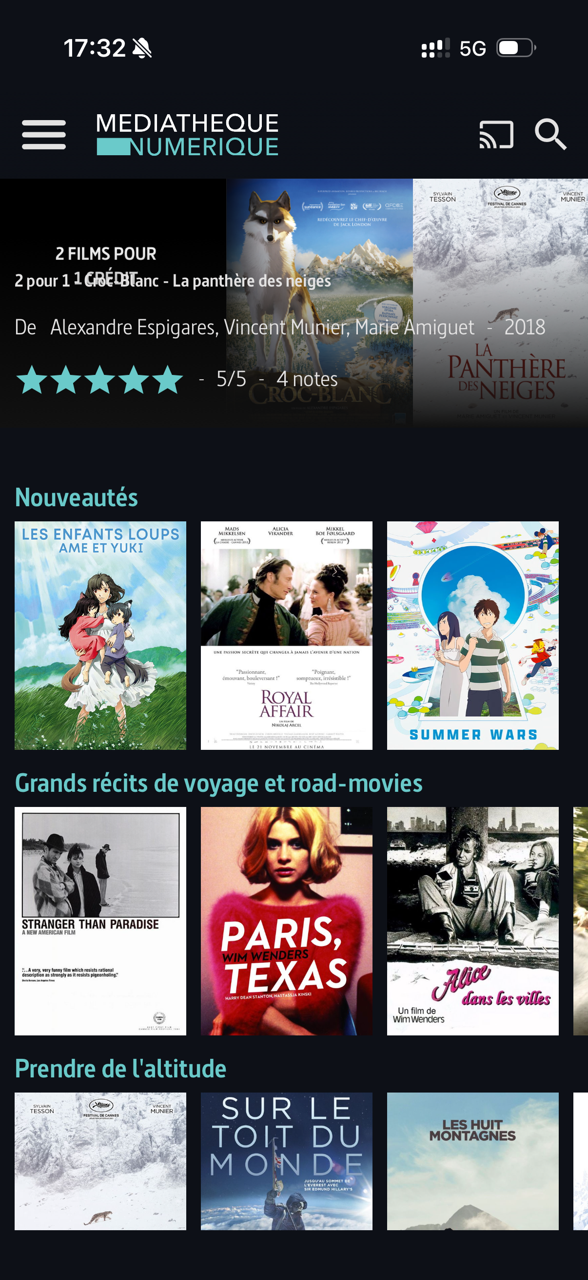 L'écran de l'application sur votre appareil se met à jour et affiche le catalogue cinéma disponible :