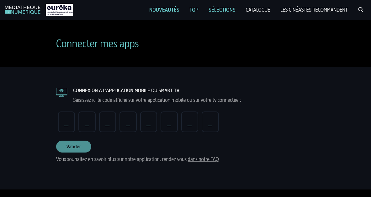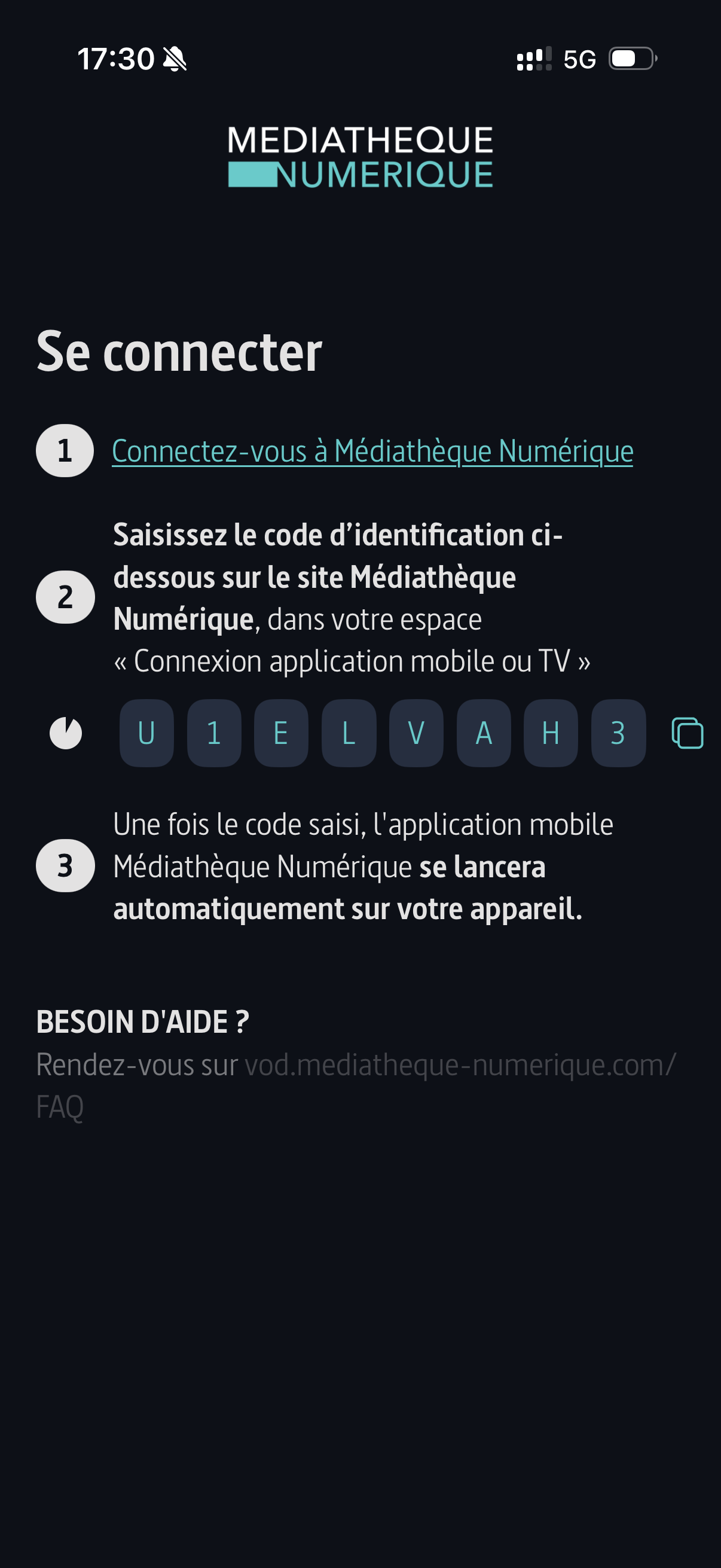 De nouveau sur le site de la Médiathèque Numérique, rentrez le code qui s'affiche sur votre appareil (smartphone, tablette, box TV ou TV)